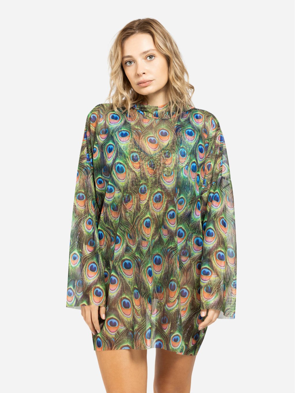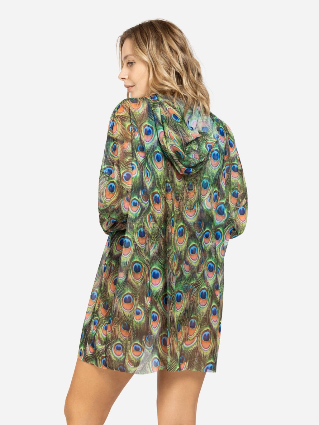 Chytré dámské tričko s kapucí "Peacock Mayura" (Oversize)